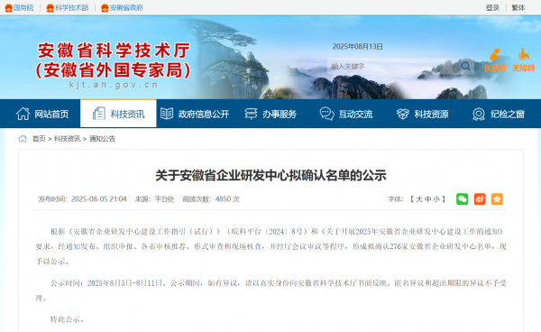 公示时间:2025年8月5日-8月11日。公示期间,如有异议,请以真实身份向安徽省科学技术厅书面反映。匿名异议和超出期限的异议不予受理。